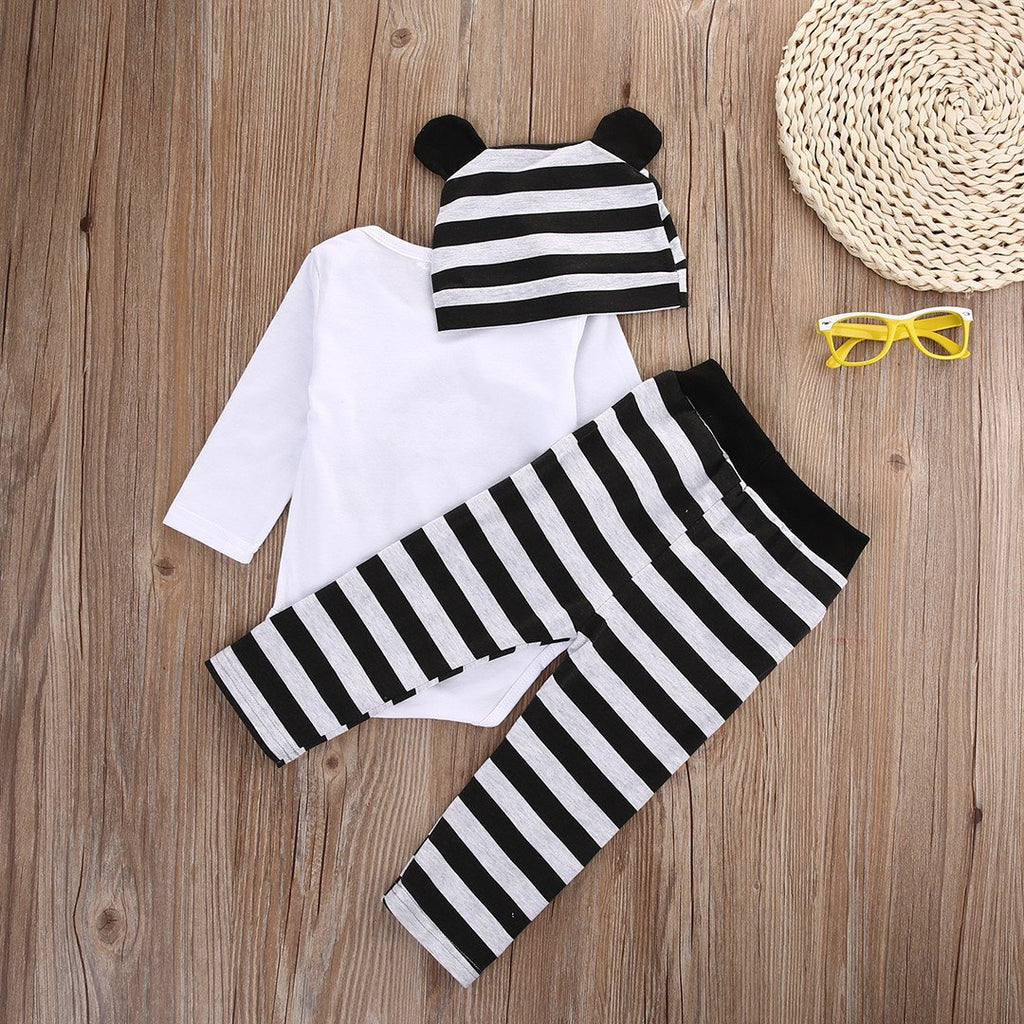 This product comes in 3 pieces: a top, striped trousers, and a hat. It is made of cotton and polyester.